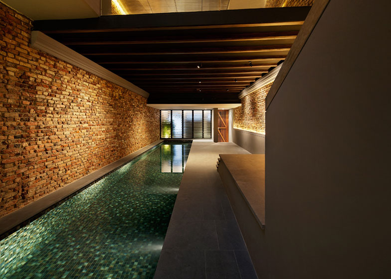 Κοίτα τι ωραία. Ωραία, δεν είναι; Τούβλα, φώτα, πισίνα, ψηφίδες, πλακάκια, άπλα, ξύλο, μια ομορφιά. Μα κοίτα: Πιθανότατα είναι ημέρα. Και για να βλέπεις να κάνεις μπάνιο πρέπει να έχεις αναμένα τα φώτα. Αυτό είναι το πρόβλημα αυτού του σπιτιού, που παλιά ήταν μαγαζί/εργαστήρι εκεί στη Σιγκαπούρη. Είναι μακρόστενο, και δε μπαίνει μέσα αρκετό φως. Αλλά είναι ό,τι πρέπει για φωτογραφία, δε μπορείς να πεις. Φτάνει να είναι αναμμένα τα φώτα.
