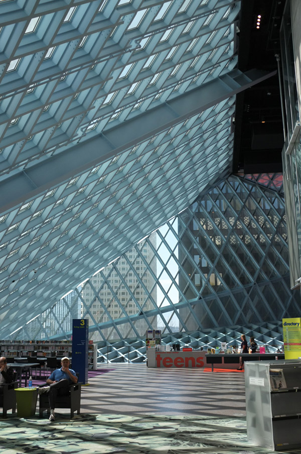 Αυτές οι φωτογραφίες (από αυτό το μπλογκ) δείχνουν τη Seattle Central Library, μια δημόσια βιβλιοθήκη που έφτιαξε ο Ρεμ Κουλχαας στη βροχερή πόλη των βορειοδυτικών ΗΠΑ. Είναι ένα μέρος φουτουριστικό και αστραφτερό και όμορφο, να πας να κάτσεις με το λάπτοπ καθώς η βρόχα μαστιγώνει τη γιγάντια γυρτή τζαμαρία από πάνω και να γράψεις μελαγχολικά αριστουργήματα όλο δάκρυ και πόνο.
