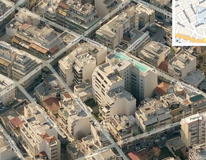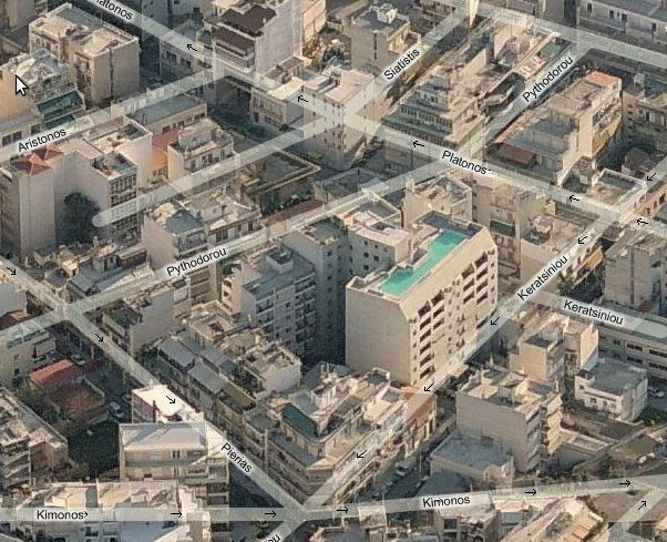 Το σπιτόσκυλο παλιότερα σου 'χε δείξει ετούτο εδώ το χτίριο στο Μεταξουργείο, που από ψηλά μοιάζει με χτίριο γραφείων ή με νοσοκομείο αλλά, όπως διαπίστωσαν οι σπιτοσκυλοφανζ είναι στην πραγματικότητα απάρτμεντ μπίλντινγκ πολυτελές στο οποίο διαμένουν διάφοροι Έλληνες σελέμπριτιζ της τηλεόρασης και του θεάτρου όπως η Σμαράγδα Καρύδη και ο Μηνάς Χατζησάββας. Ο αετομάτης σπιτοσκυλοφαν eep (πιθανότατα όχι το αληθινό του όνομα) εντόπισε την πισίνα στην ταράτσα του κτιρίου αυτού στο site του μάστορα που έκανε τις τσιμεντοκονίες εκεί πέρα. Από πάνω βλέπεις πισίνα, από κάτω δες πρόσοψη.