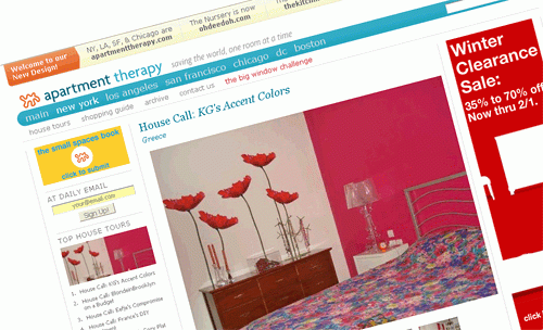 Κι εκεί που το σπιτόσκυλο χάζευε στα Ίντερνετς, ψάχνοντας τι καινούριο να παρουσιάσει στο λαό του, έπεσε σε ένα διαμέρισμα που του φάνηκε γνώριμο. Και ήταν: Το σπίτι της kg από τις Σέρρες, που το έχεις δει προ καιρού (και εδώ), εμφανίστηκε στο Apartment Therapy, το μεγαλύτερο σπιτομπλογκ του κόσμου, κάτι σαν το σπιτόσκυλο αλλά στο πιο international.
