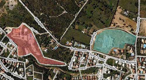 Ο Μανώλης στέλνει και την εξής φωτογραφία, που δείχνει πού βρίσκονται τα δυο σπίτια (του Εμφιετζόγλου με κόκκινο, το άλλο -του Κοπελούζου;- με μπλε):