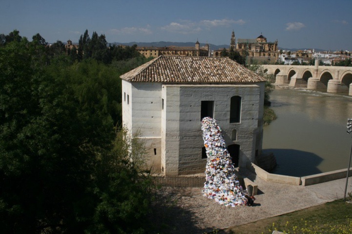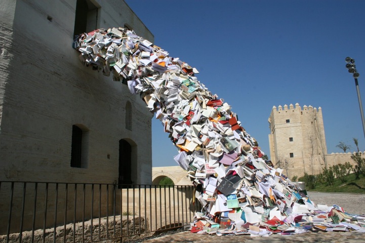 Η καλλιτέχνις Αλίθια Μαρτίν φτιάχνει κάτι installations που μοιάζουν με ένα ποτάμι βιβλίων που ξεχειλίζει απ' το παράθυρο κτιρίων. Ωραία είναι.