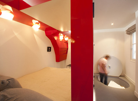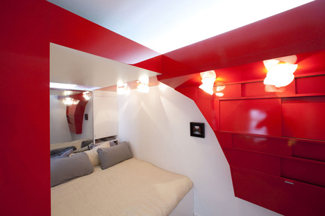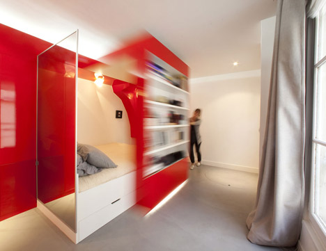 Ετούτο εδώ είναι ένα μικροσκοπικό διαμερισματάκι 23 τετραγωνικά στο Παρίσι που έχει ένα κόκκινο στοιχείο μέσα στη μέση που στις φωτογραφίες βλέπεις να το τσουλάει μια κυρία που το τσουλάει τόσο γρήγορα που δεν την πιάνει ο φακός, τόσο γρήγορα που καλά καλά δεν καταλαβαίνεις αν είναι κυρία. Το σπιτόσκυλο δεν κατάλαβε ακριβώς τί κάνει το τσουλητό στοιχείο, πέρα απ' το να πηγαίνει μια μικρή βόλτα τους επιβάτες του κρεβατιού, αλλά καταλαβαίνεις, όποτε βλέπει τέτοια κάτι το πιάνει και πρέπει να στα δείξει. θυμήσου κάτι αντίστοιχο στο Χονγκ Κονγκ, στο πιο κίτρινο.